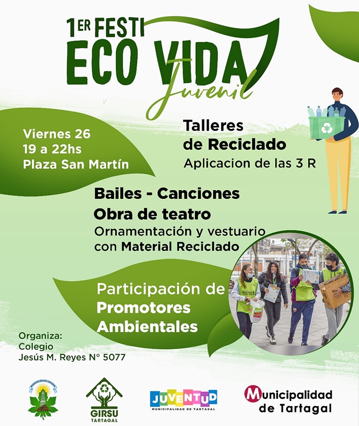 Con el acompañamiento de las áreas municipales de la Dirección de Medio Ambiente y la Coordinación de la Juventud, a partir de las 19 horas de mañana jueves se presentará el 1° Festi Eco-Vida Juvenil en Tartagal, presentado por los estudiantes del Colegio “Jesús Miguel Reyes” (V° Saavedra), en Plaza San Martín. El espacio se extenderá hasta las 22 horas y además de la exhibición de los proyectos trabajado por el alumnado en los distintos stands que se dispondrán se impartirá un taller de reciclado.
