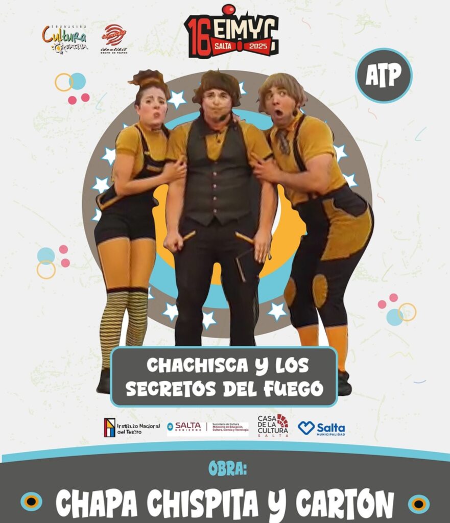 – “Chaschisca en 2 Actos”, de la Compañía Chapa, Chispita y Cartón (Buenos Aires, Argentina), que presenta un espectáculo de circo, clown y teatro físico con acrobacias y creatividad escénica. Se presentará en la mañana y la tarde, a las 10 y 16 horas; respectivamente.