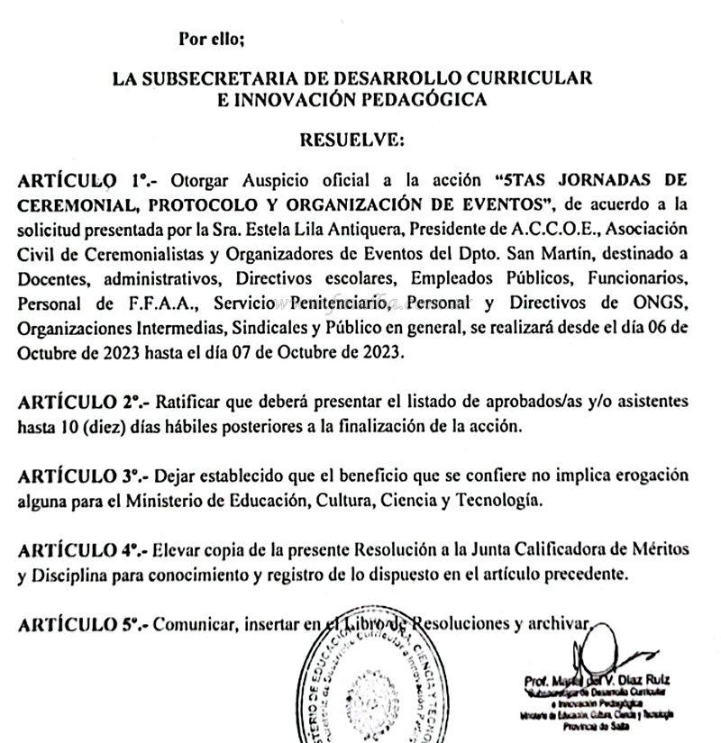 Por este último motivo, la ACCOE; Asociación Cvil de Ceremonialistas y Organizadores de Eventos; informó que la Subsecretaría de Desarrollo Curricular del Ministerio de Educación de Salta emitió la resolución N°200 y establece así el otorgar puntaje a los educadores que participen de la 5° Jornadas de Ceremonial y Protocolo; la cual equivale a 16 horas cátedra bajo el marco de modalidad presencial, se lee en los considerandos.
