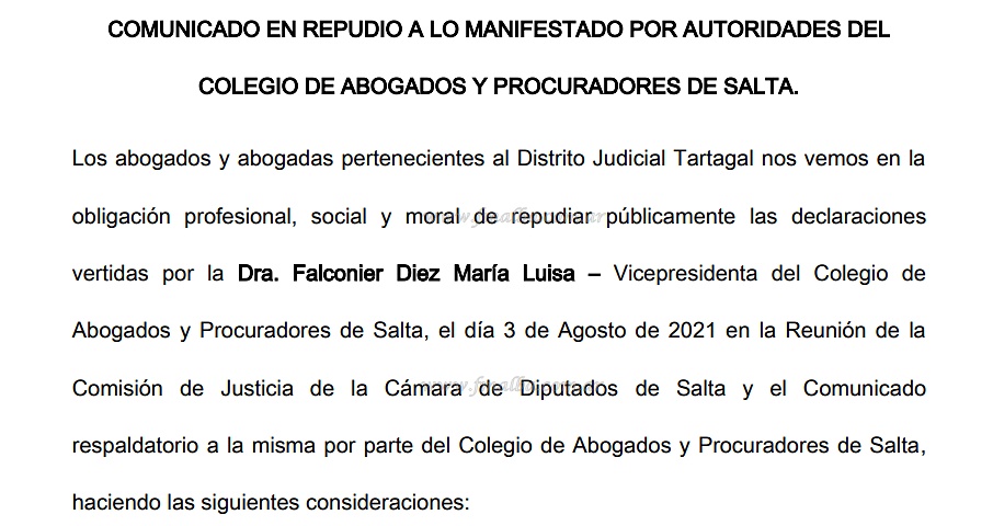 Sin embargo, la explicación no convenció a los abogados y además de emitir el comunicado de repudio; con la firma de 50 personas y manifestaciones de apoyo de diversos sectores; solicitaron la renuncia de la Dra. Falconier Diez y el correspondiente tratamiento de su conducta ante el Tribunal de Ética Profesional para determinar la sanción que corresponde.