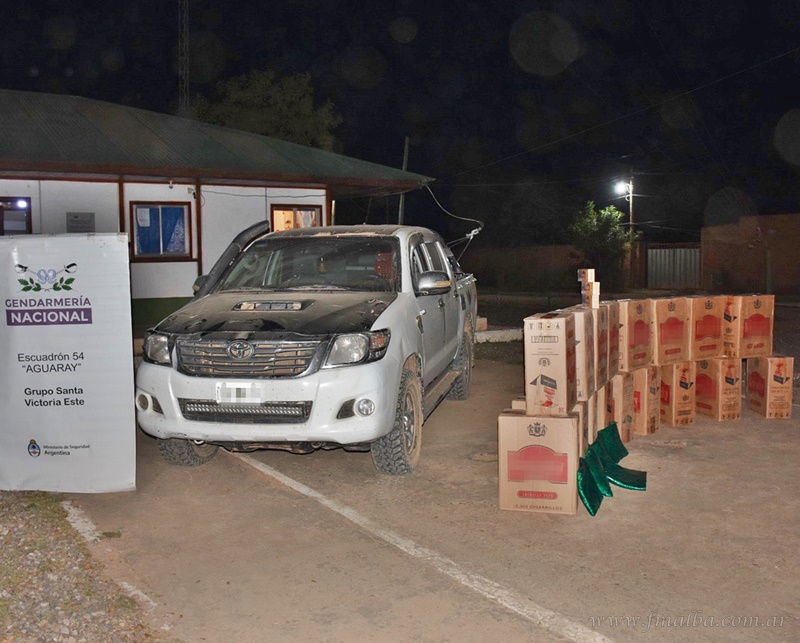 Efectivos del Escuadrón 54 “Aguaray” interceptaron el traslado de 8.550 atados de cigarrillos y 5 kilos de hojas de coca que transportaba en 17 cajas una camioneta Toyota Hilux color blanco doble cabina, sin la correspondiente documentación. El operativo se realizó a la altura del kilómetro 63 de Ruta Provincial N°138, cuando recorrían las cercanías del Paraje Pozo del Rancho, Alto La Sierra; municipio de Santa Victoria Este. Una de las personas involucradas tenía prohibido salir del país sin orden judicial.