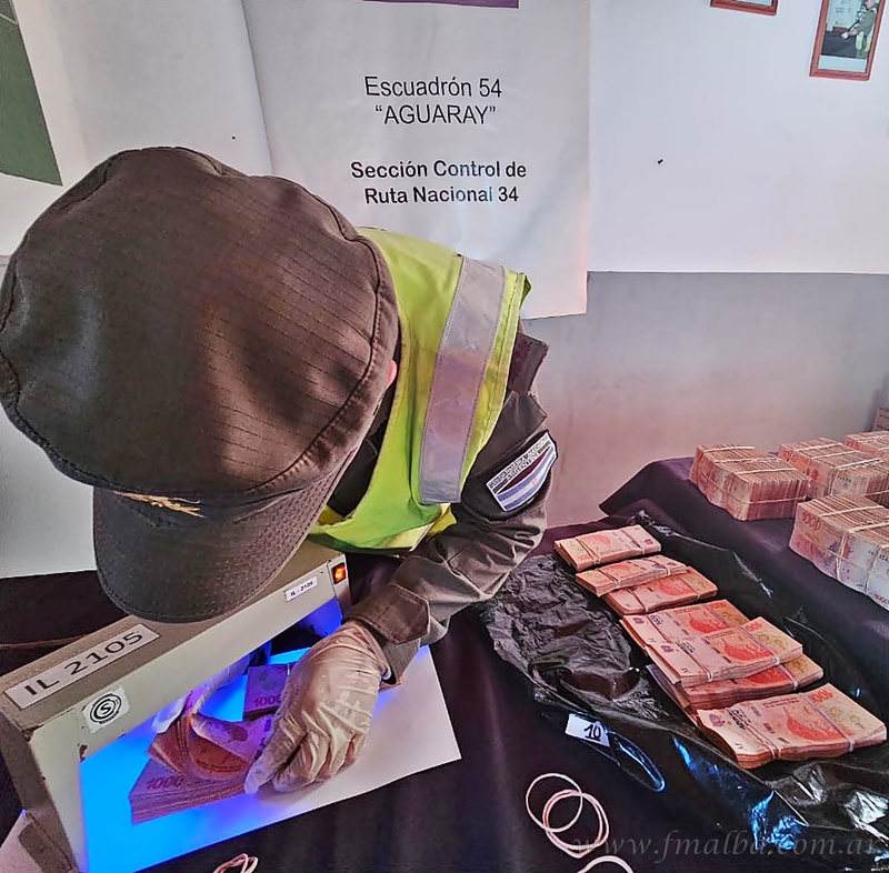 Gendarmes del Escuadrón 54 “Aguaray” pertencientes a la Sección Control de Ruta Nacional 34 interceptaron el contrabando de 129.887.000 pesos argentinos distribuidos en 14 bultos; embalados con bolsas de consorcio y cinta; que transportaba un viajante con dirección a la frontera. Intervinieron la Unidad de Investigaciones de Delitos Complejs y Procedimientos Judiciales “Orán” y la Fiscalía Federal de Tartagal.