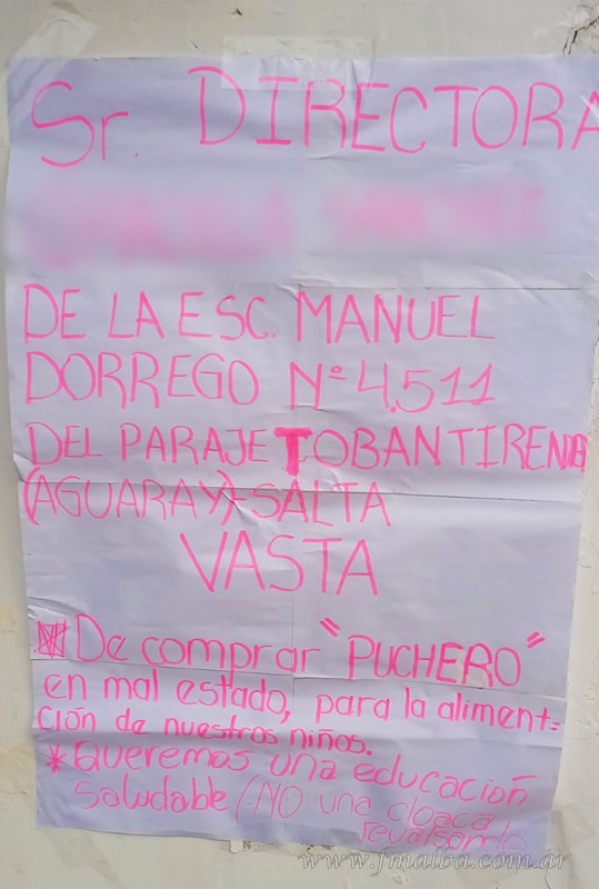 La docente Mariela Álvarez (Docentes Autoconvocados), a propósito de lo que ocurría esta jornada ante el establecimiento, destacó que ya anteriormente se habían expuesto las condiciones de abandono que presentaba; malezas crecidas, presencia de alimañas, daños en los techos que deben repararse y falta de agua. De allí que las familias de los alumnos se convocaron a la toma de la Escuela; perteneciente al éjido municipal de Aguaray; para que se aborden las medidas del caso.