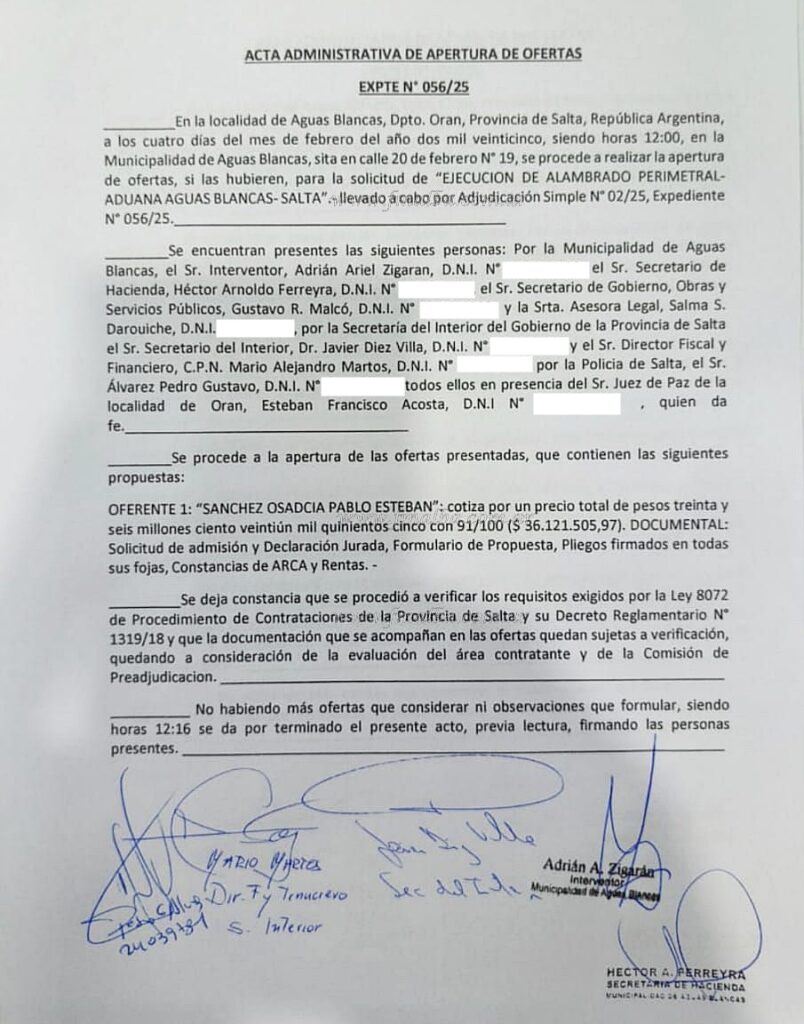 Este martes 4 de febrero, en la Municipalidad de Aguas Blancas, se llevó adelante la apertura de sobres de la licitación para la construcción de alambrado perimetral en la localidad; delimitación que se extenderá por 200 metros, comenzando en la Terminal de Ómnibus y finalizando en las oficinas de la Dirección Nacional de Migraciones.