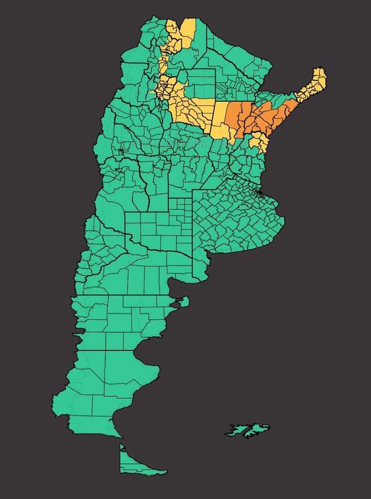 El informe del SMN establece el alerta amarilla para los departamentos del norte, puntos donde se esperan focos puntuales de tormenta y gran caída de agua en poco tiempo, además de ráfagas, tormenta eléctrica, posible caída de granizo y para buena parte de la región valores de lluvias que oscilarán entre moderado a abundante (región centro-oeste de Salta), con registros de 25 a 50 mm; mientras que hacia el litoral se esperan marcas por arriba de los 120 mm.