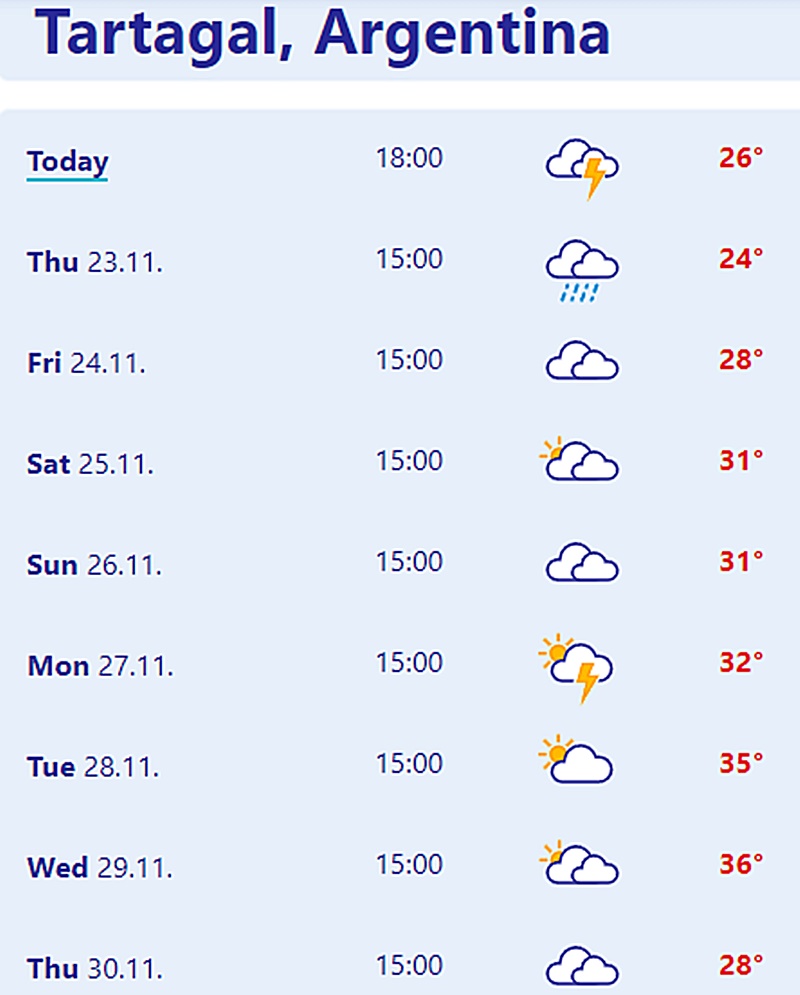 El frente frío con tormentas continúa así su lento avance hacia el norte. El pronóstico del Servicio Meteorológico Nacional para Tartagal y la región anuncia un jueves con 10 grados menos que lo previsto para este miércoles 22, además de inestabilidad con probabilidad de continuidad de lluvias; para continuar desde el último viernes de Noviembre a prevalecer tiempo más estable en todas la s provincias del norte argentino.