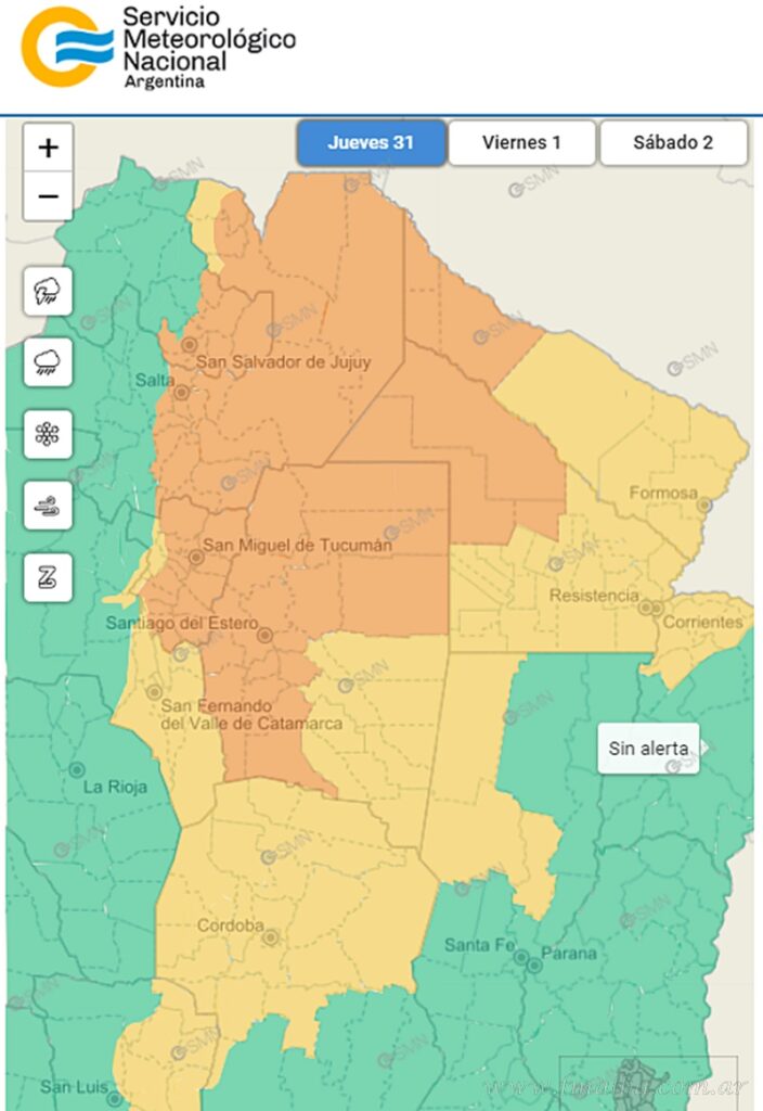El Servicio Meteorológico Nacional emitió alerta naranja por tormentas fuertes a muy fuertes para 19 departamentos salteños, alertando sobre la llegada de tormentas localmente fuertes o severas, acompañadas por ráfagas intensas que pueden superar los 90 km/h, actividad eléctrica, posible caída de granizo de diversos tamaños y principalmente abundante caída de agua en cortos períodos; estimando valores que oscilarían entre 50 a 80 mm.
