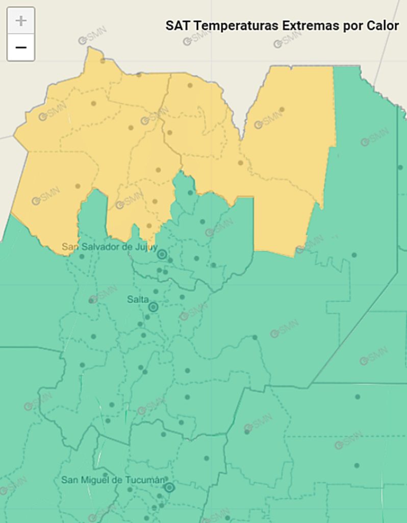 El Servicio Meteorológico Nacional emitió dos alertas amarillas para los departamentos del norte salteño; por altas temperaturas y por tormentas fuertes. Se estima que los valores en sensación térmica ostentarán una diferencia de hasta 5 grados con el registro y superarán los 40 grados. En lluvias, se esperan precipitaciones de entre 30 y 60 mm.