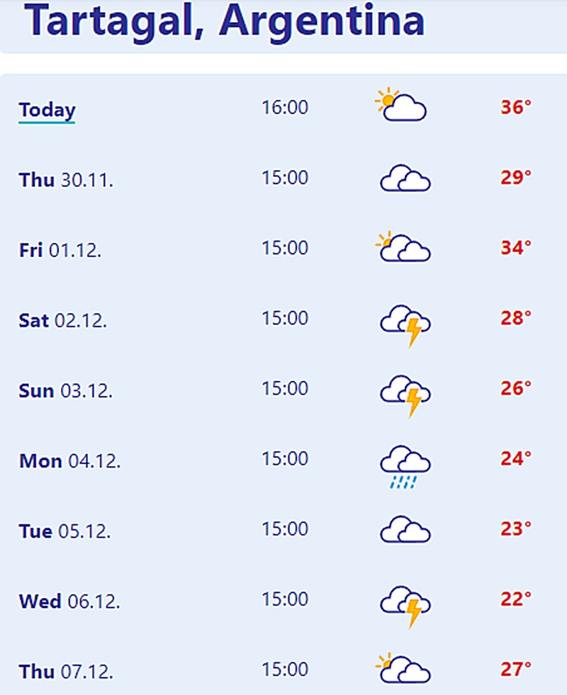 El calor en la región, que en sensación térmica superó los 40 grados ayer martes 28 y este miércoles por la mañana en Tartagal (a las 09 horas encabezaba el Ránking del SMN en ciudades cálidas), dará lugar a un descenso tardío, llevando los registros por debajo de los 30 grados (a excepción de este viernes 1 de Diciembre) en la siguiente semana, producto del retroceso de los vientos del Trópico ante el avance de un sistema frontal frío, a su vez provocando el desarrollo de lluvias y tormentas de muy fuerte intensidad.