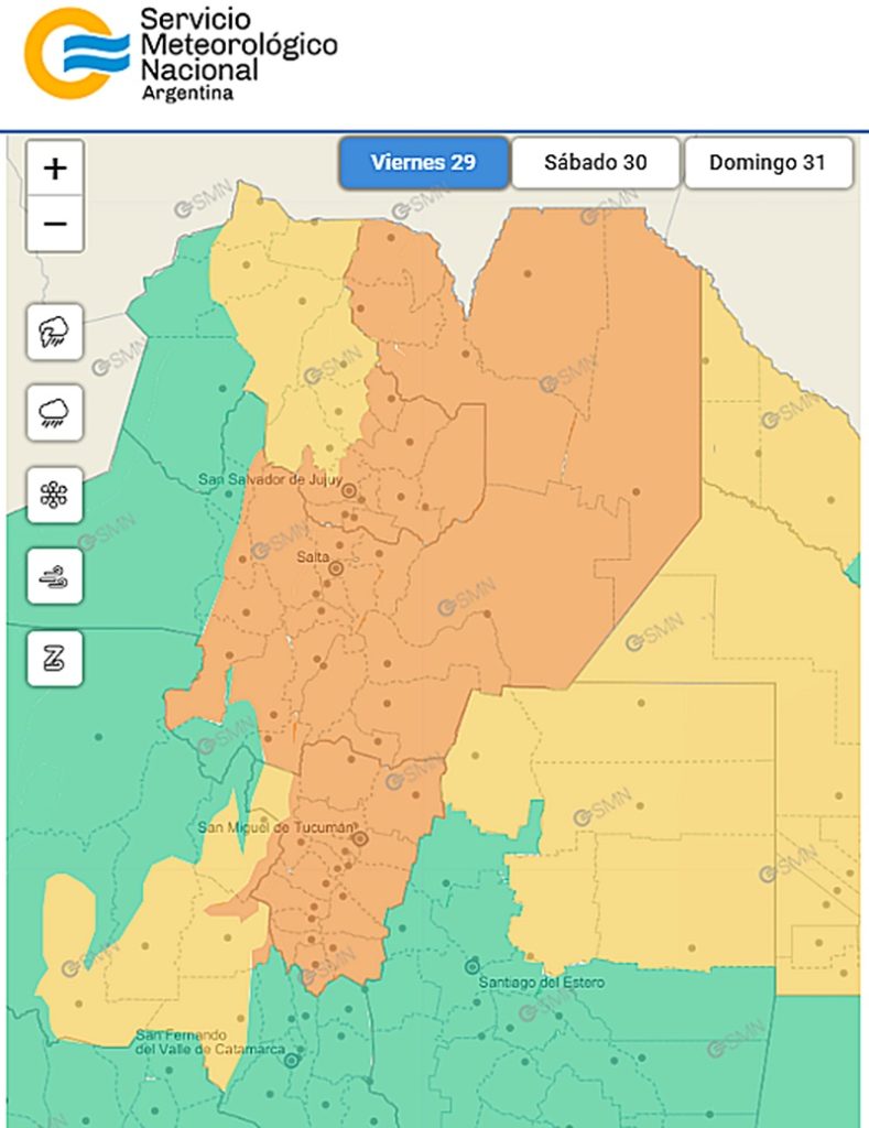 Para los departamentos San Martín, Orán y Rivadavia se emitieron dos informes por parte del Servicio Meteorológico. El arribo a la región de un frente frío inicia con alerta amarilla por lluvias y tormentas intensas para este viernes por la tarde (a las 12 horas la térmica llegó a los 38 grados en Tartagal), acompañadas por ráfagas intensas provenientes del sur, fuerte actividad eléctrica, ocasional caída de granizo y abundante caída de agua en cortos período; estimando valores de precipitación acumulada entre 30 y 80 mm.