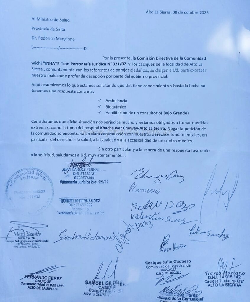 En un comunicado que elevaron al ministro de Salud de Salta, Dr. Federico Mangione, los manifestantes reclaman la necesidad de recursos con lo que no cuentan ya desde hace varios años y por esa razón, este lunes tomaron el Hospital “Khacha wet Choway – Alto la Sierra”. Entre lo que precisan detallan ambulancia propia, medicamentes, nombramientos de agentes sanitarios (APS) y un bioquímico.