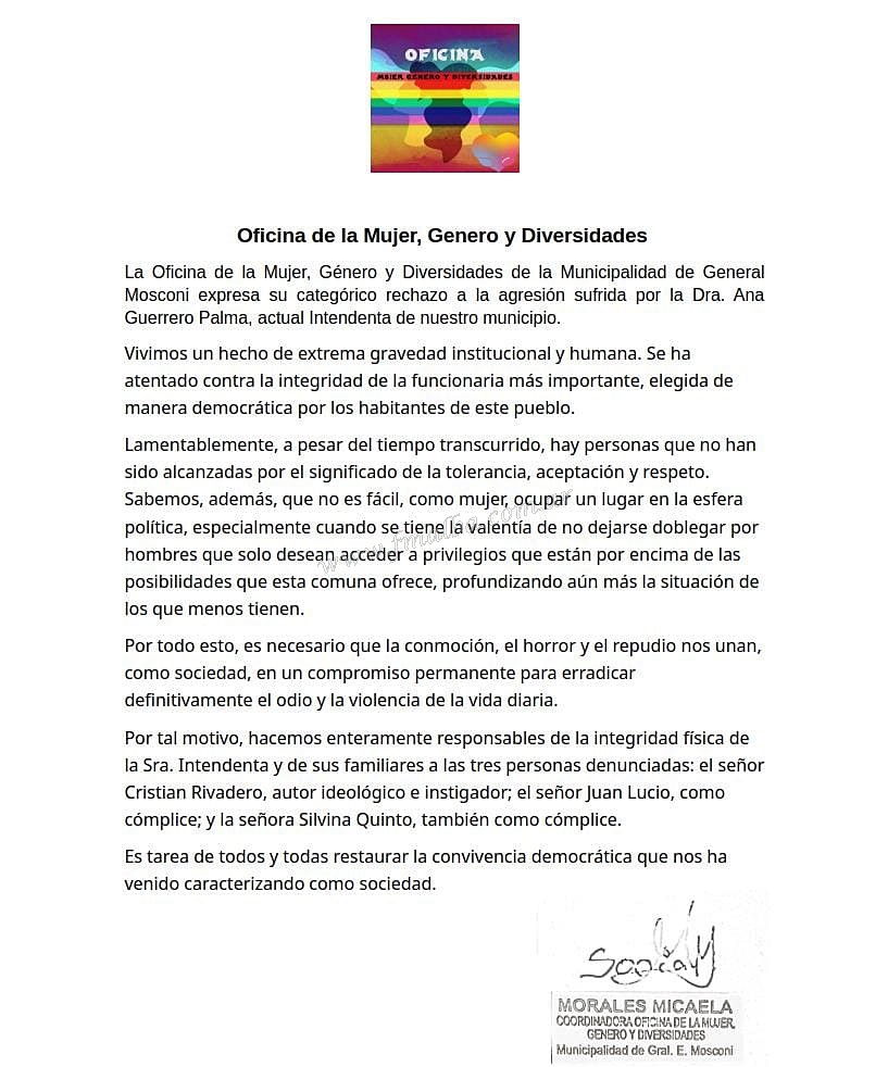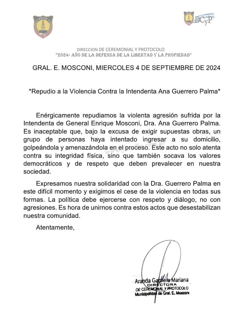 La fiscal penal Lorena Martínez dispuso medidas cautelares para proteger a la intendente de Ana Guerrero Palma, quien fue atacada y agredida en su domicilio. “Exigen que se construyan núcleos húmedos, se han puesto en una tesitura muy violenta”, declaró a medios de Mosconi. Se ordenó recolectar pruebas, entre ellas testimonios de vecinos y el análisis de cámaras de seguridad en la zona. La acusación apunta a Juan Lucio, Silvina Quinto y Cristian Rivadero.
