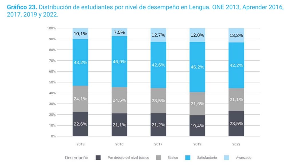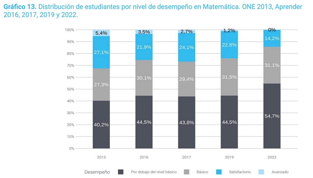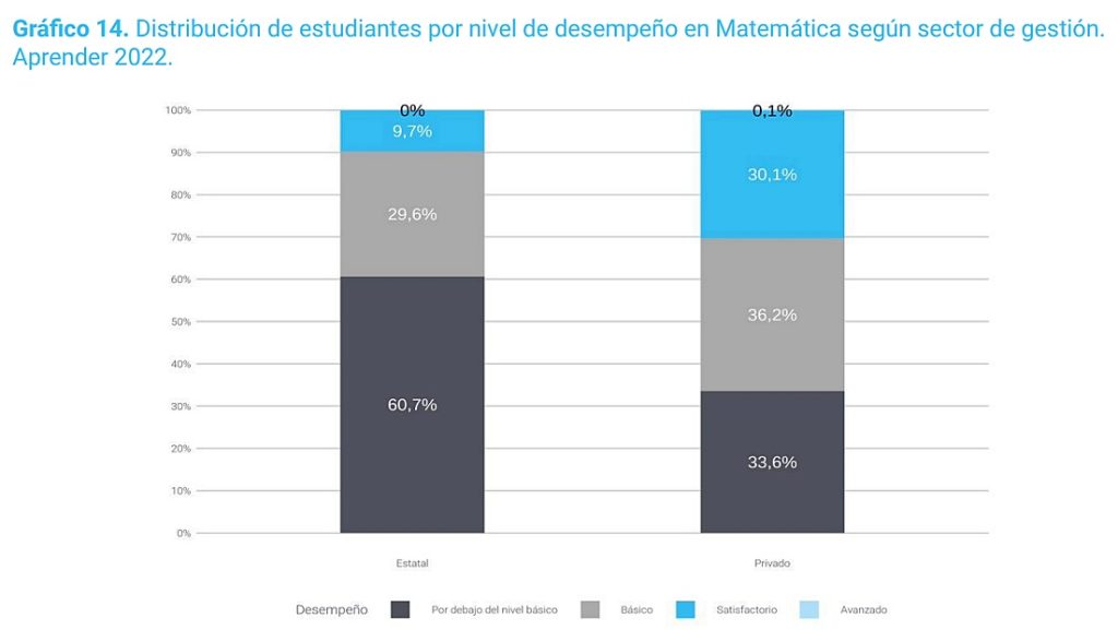 En cuanto al nivel de desempeño en Matemática según el sector, el 60.7 por ciento (por debajo del nivel básico) pertenece al público y el 33.6 por ciento al privado. En el ámbito rural se llegó al porcentual más complicado desde el inicio de las aprender, un sector que solo en 2017 (58.1%) bajó del 60 por ciento, en 2022 expone el 69.5 por ciento. Las mujeres (59.2%) presentan más problemas en el nivel de aprendizaje que los varones (48.8%); con la particularidad que el informe registra el desempeño de estudiantes no binarios (70.7%).