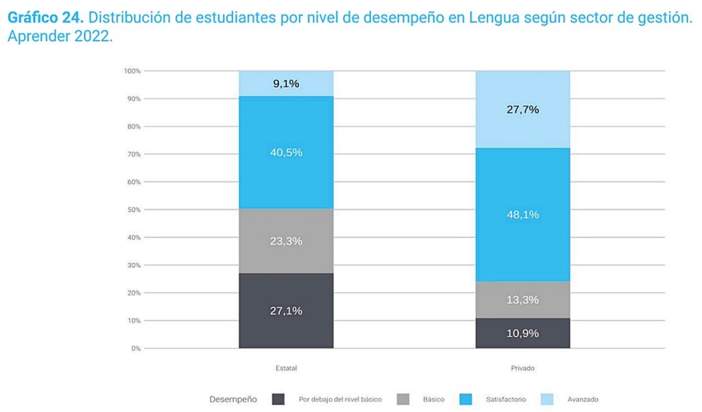 En Lengua, el desempeño también se ha deteriorado, aunque en menor proporción; con el 23.5 por ciento (19.4% en 2019). El sector privado muestra un mejor desempeño (10.9%) frente al estatal (27.1%) en cuanto a porcentual por debajo del nivel básico, pero ambos superan el 40 por ciento en nivel “Satisfactorio” de conocimiento. El privado evidencia 48.1 por ciento y el público 40.5 por ciento. También en Lengua, los varones (23.7%) arrojan un mejor desempeño que las mujeres (22.6%), pero con una mínima diferencia.