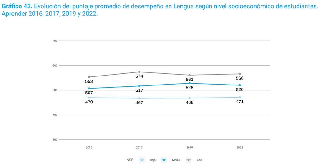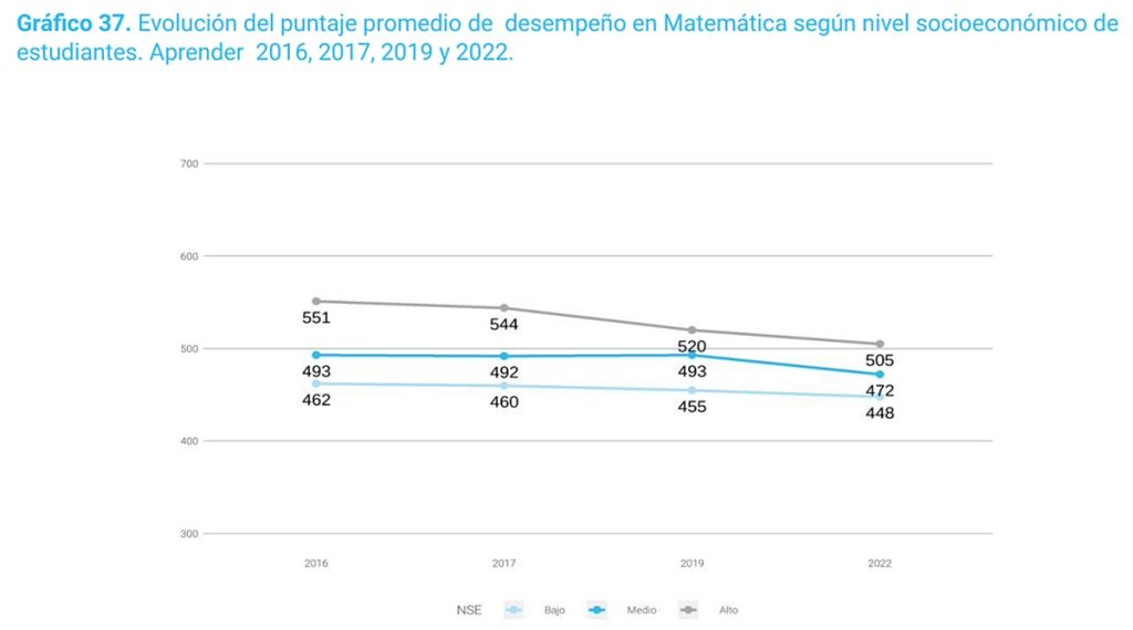 Las pruebas Aprender 2022 revelan así la pérdida de logros alcanzados por el aprendizaje luego de la pandemia. Los estudiantes pertenecientes a nivel social con bajos ingresos aumenta el porcentaje de conocimiento por debajo del básico en Matemáticas desde 2016 (55.7%), tocando el 67.1 por ciento; datos que alcanzan a todos los estratos. En hogares de clase Media llegan a 49.7 por ciento (39.9% en 2019) y en clase Alta al 32.7 por ciento (29.3% en 2019).