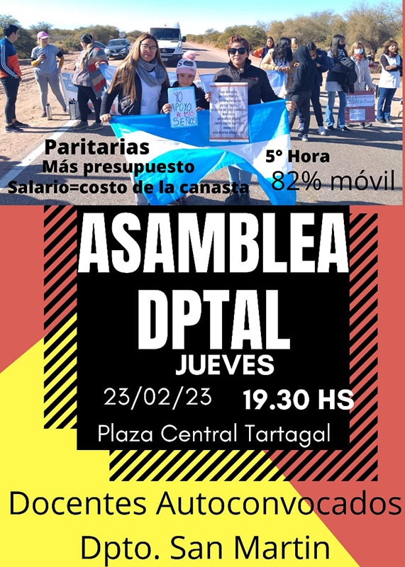 Docentes Autoconvocados del departamento San Martín fueron llamados a participar de la asamblea en Plaza Central, hoy jueves por la tarde, en Tartagal. Entre los temas que abordarán figuran paritarias, salario, 82 por ciento móvil y las recientes designaciones docentes como también la implementación de la 5° hora de clases para el Ciclo Lectivo 2023.