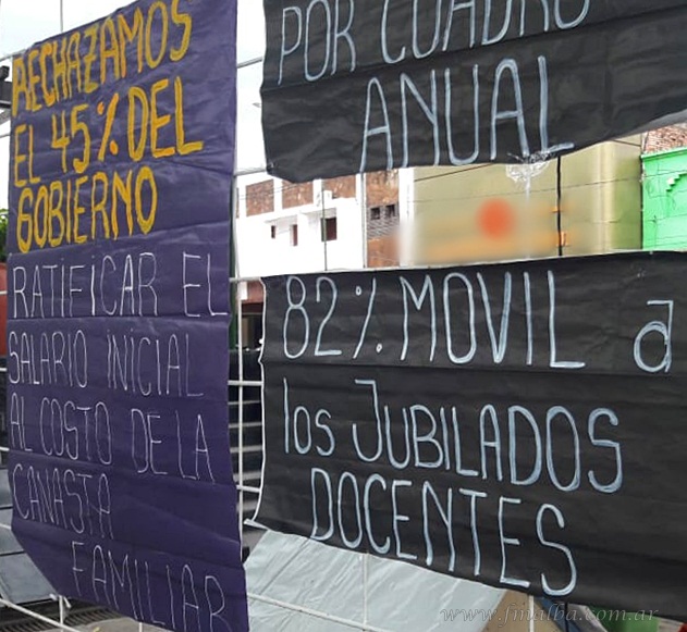 – Movilización con jornada de antorchas el próximo jueves 17 a las 19 horas en las plazas principales de la provincia en contra de los descuentos, por el rechazo al aumento del 45 por ciento mentiroso del gobierno y nuestras principales reivindicaciones como el salario mínimo igual al costo de la canasta familiar por cargo, titularizaciones, nombramientos de personal de maestranza, presupuesto para infraestructura, rechazo al accionar de la junta electoral de ADP que intenta proscribir a la lista Unidad
