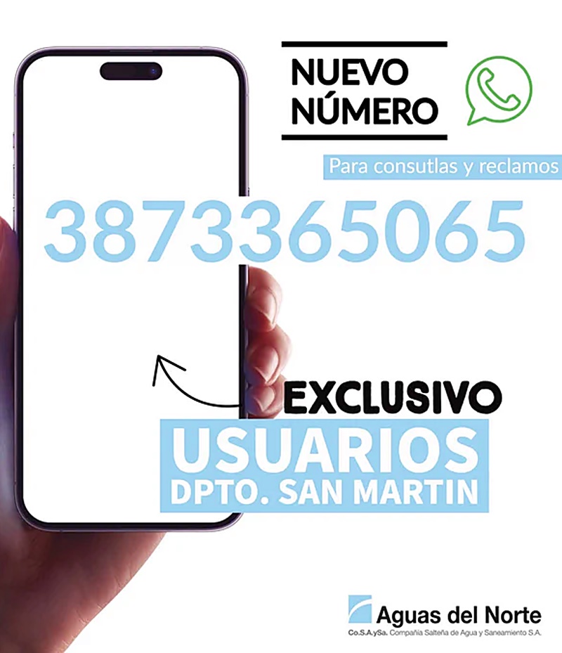 El usuario podrá realizar los pedidos de agua, consultas o reclamos a a través de la línea gratuita 0800 88 88 2482, como también al número exclusivamente dispuesto para consultas a través de WhatsApp solo para el departamento San Martín: (387) 3365 065.Cabe recordar que el Caraparí es un río de origen pluvial, por lo que su régimen de caudal es muy irregular. En su recorrido, desde su naciente en las serranías del Aguaragüe (Bolivia) y en las sierras de Tartagal y Alto de Macueta, recibe la mayor cantidad de afluentes sólo en la cuenca alta en su descenso hacia el Dique Itiyuro.