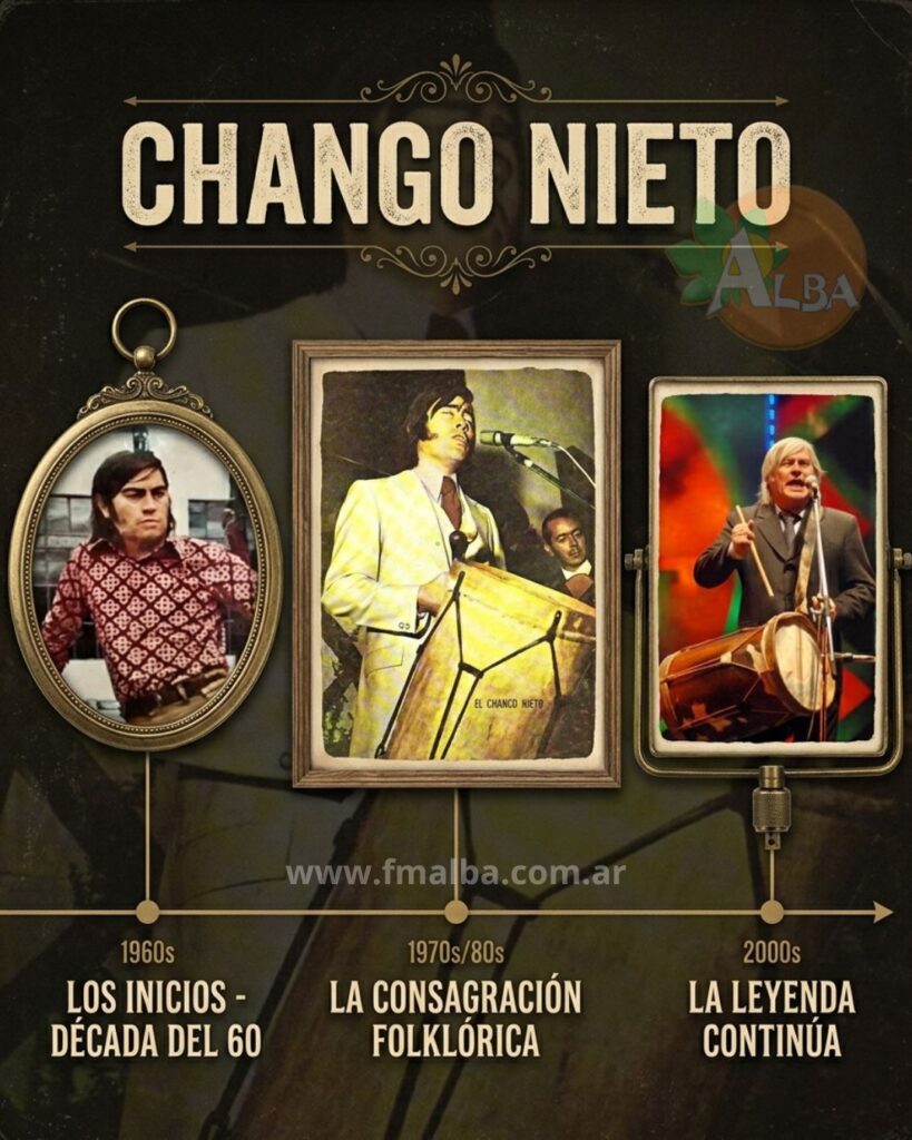 Nacido en 1943 en Campamento Vespucio, el Chango Nieto se convirtió en una figura fundamental de la canción popular argentina. Su busto, donado en su momento por Pitín Salazar, preside la plazoleta donde cada abril se reúnen vecinos y visitantes para recordar su voz y su aporte a la cultura nacional.