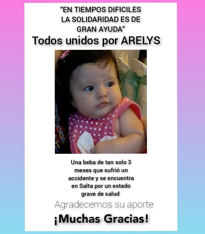 La familia de Arelys, una bebé de tres meses, compartió la cuenta disponible en banco Macro para recaudar los fondos que necesitan para sobrellevar la atención médica que requieren para la menor a raíz del accidente que la afectó días atrás. La bebé está internada en Salta Capital, luego de un paso por el Hospital Público de Orán.