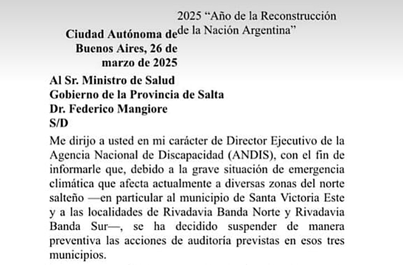 El director ejecutivo de la Agencia Nacional de Discapacidad, Diego Spagnuolo, informó así al ministro Mangione sobre la decisión de suspender preventivamente las auditorías en los municipios de Santa Victoria Este, Rivadavia Banda Sur y Rivadavia Banda Norte, “ante la grave situación de emergencia climática”, ya que “no están dadas las condiciones mínimas” para el trabajo que deben llevar adelante, se lee. No obstante, el operativo se realizará en fecha a coordinar con el Ministerio, cierra.