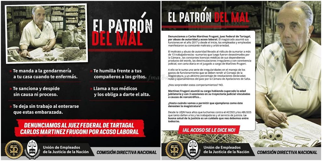 A través de un comunicado de prensa, la Unión de Empleados de la Justicia de la Nación; UEJN; expuso ante el Consejo de la Magistratura de la Nación, a través de sus representantes gremiales, Julio Piumato, Secretario General; y Rocío Herrara, Secretaria de Protección Individual; las situaciones de maltrato que viven los empleados del Juzgado Federal de 1° Instancia de Tartagal cuyo titular es el juez Carlos Alberto Martínez Frugoni. Abuso de autoridad, maltrato y acoso laboral son algunos de los puntos elevados.