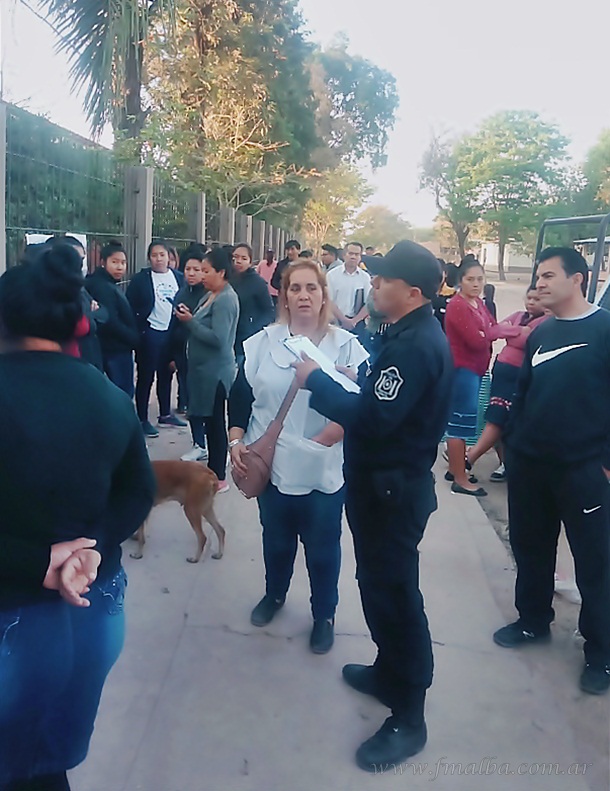 “La directora (Angelita Gómez) recién ahora nos llamó a una reunión, cuando muchas veces se le pidió hablar, pero ella nos decía que presentáramos una nota y nada más (…) ya no queremos hablar (…) queremos que baje alguien del Ministerio de Educación porque esta situación ya no se sostiene”, dijo la referente. Personal de la Comisaría 42 se había acercado a la comunidad para tomar nota de la protesta, que impedía el ingreso de alumnos y personal docente.