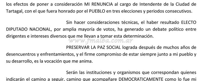“Preservar la paz social lograda después de muchos años de desencuentros y enfrentamientos y el firme compromiso de estar junto a mi pueblo y su desarrollo es la vocación que me anima”, consta en el tercer párrafo, lo que puede entenderse como respuesta a los dichos vertidos por el diputado nacional del oficialismo.