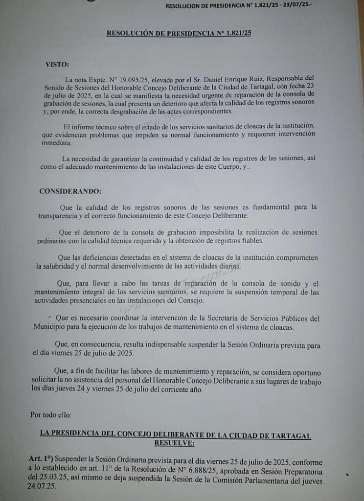 Mediante resolución de presidencia N° 1.821/25, Armando Leguizamón; titular del Concejo Deliberante; informó que por “urgente reparación” de la consola de grabaciones y por “intervenciones inmediatas” en los servicios sanitarios del edificio, es que este jueves 24 de julio no habrá sesión parlamentaria y mañana viernes 25 de julio no habrá sesión ordinaria.
