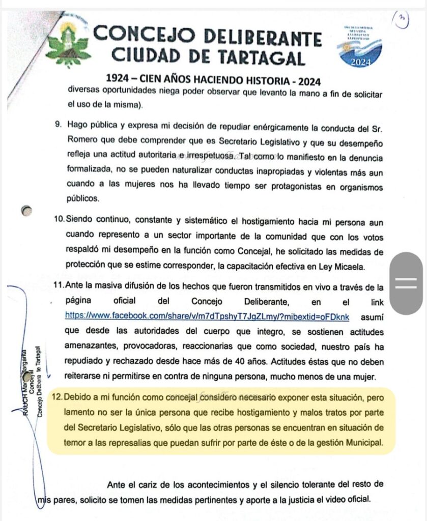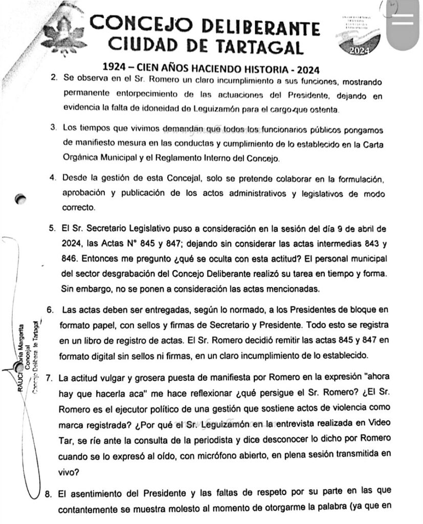 Además, ingresó nota a la presidencia del Concejo en relación a lo ocurrido, donde resalta el pedido tanto del cese de accionar del secretario Romero en sus conductas como también de separarlo del cargo en ejercicio y la conformación de una comisión investigadora “que determine las sanciones que correspondan, para ello suspender de sus funciones como presidente del cuerpo hasta que la comisión resuelva las sanciones que correspondan”; señala; para no naturalizar hechos de violencia de género, dado que no sería el único caso que tiene a Romero como responsable.