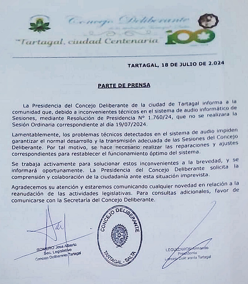 El parte de prensa emitido y del cual se hizo saber al cuerpo de concejales señalaba que “los problemas técnicos detectados en el sistema de audio impiden garantizar el normal desarrollo y la transmisión adecuada de las sesiones del Concejo Deliberante. Por tal motivo, se hace necesario realizar las reparaciones y ajustes correspondientes para restablecer el funcionamiento óptimo del sistema”, se lee.