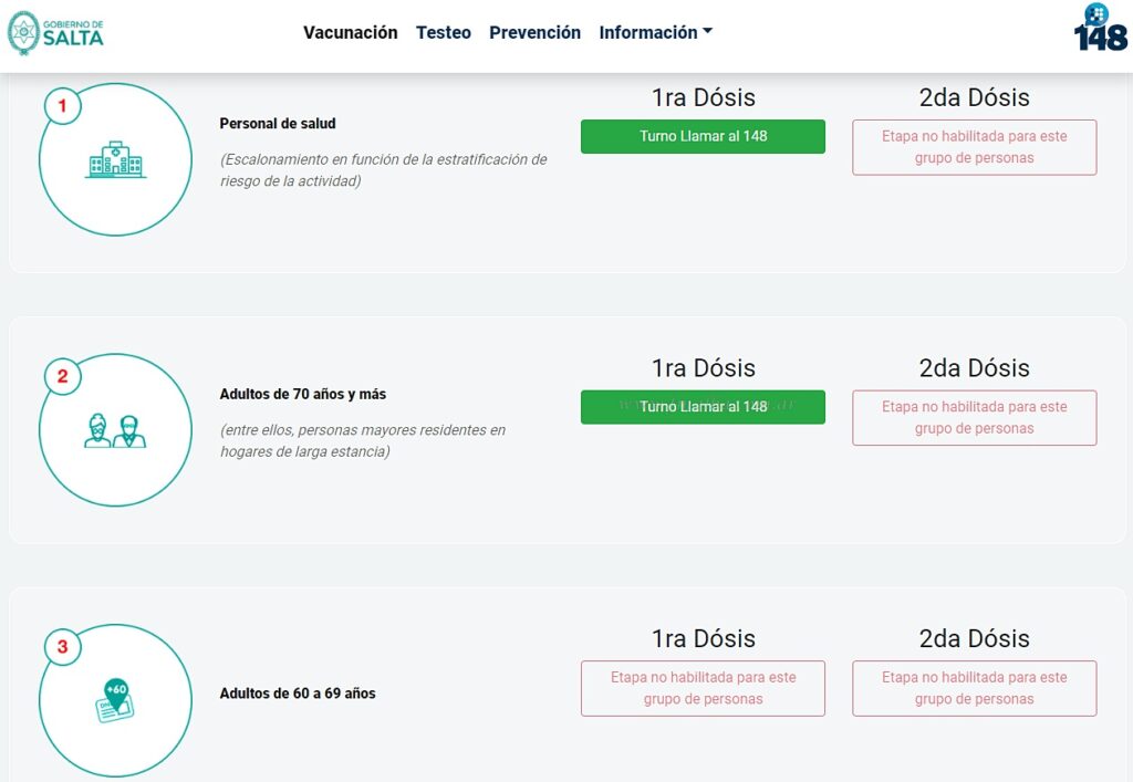 En la página web dispuesta se podrá encontrar información sobre la campaña, respuesta a las preguntas frecuentes e información en línea sobre disponibilidad de turnos en base a la llegada de nuevas dosis y la habilitación de nuevos grupos de personas. En Capital, Metán, Rosario de la Frontera, Tartagal, Orán, Cafayate y General Mosconi se ubicarán “unidades de vacunación“.