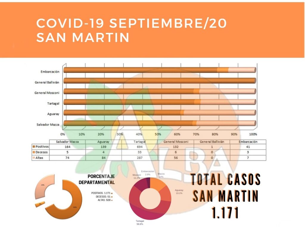 La ciudad de Tartagal cerró la semana con 694 casos de Covid-19, cifra a la que llegó este viernes 4 de septiembre; con 41 nuevos positivos, además de 74 altas médicas y 2 decesos. La capital del departamento San Martín continúa como el distrito rojo por la cantidad de afectados.