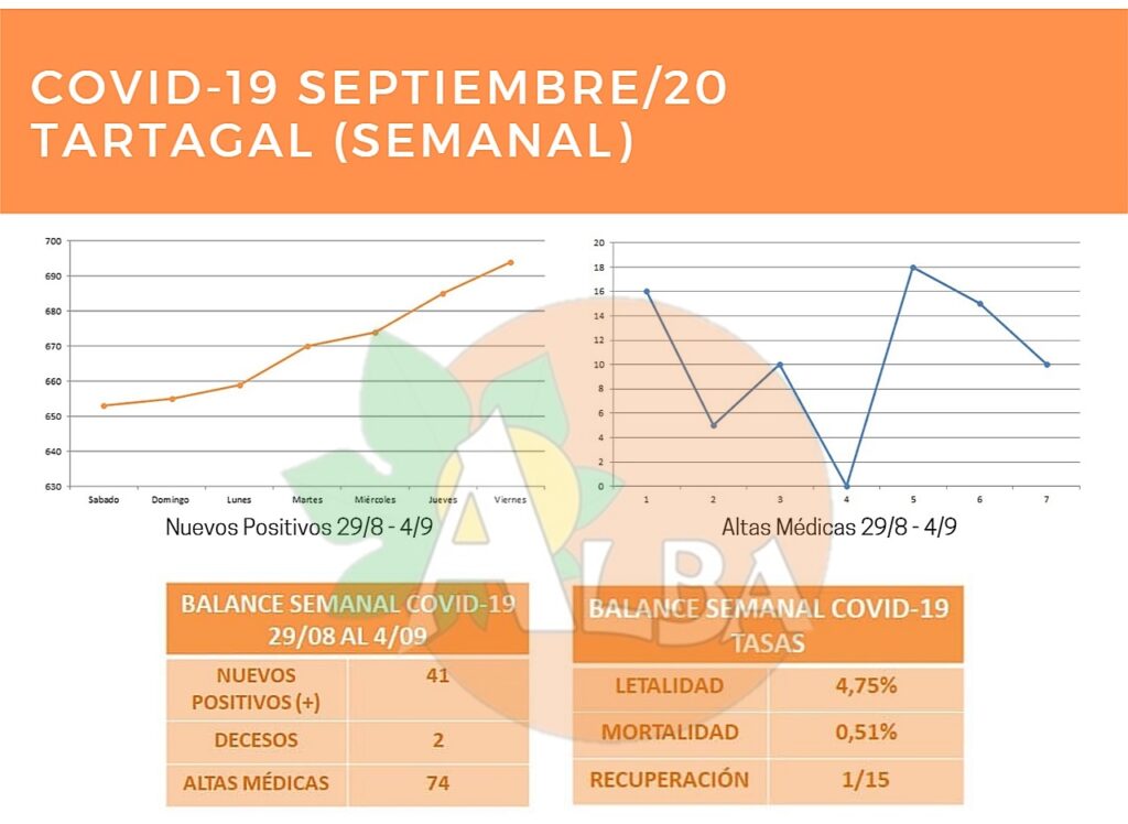 En el caso particular de Tartagal, del 28 de agosto al 4 de septiembre, se notificaron 41 nuevos casos positivos, se anotaron 74 nuevas altas médicas (promedio de 10 por día) y se registraron dos decesos.