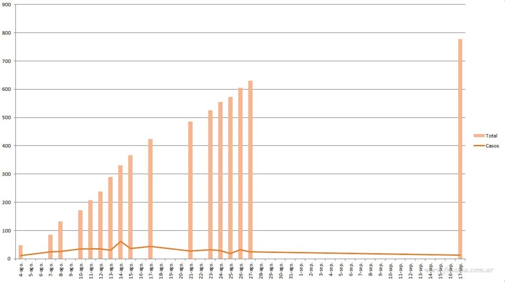 En promedio, se anotaron 7.3 nuevos casos por día y la tasa de letalidad se coloco en 5.25, en base a los datos proporcionados por el CIO Tartagal. No obstante, por segunda semana consecutiva, no se han registrado nuevos decesos por el virus. En base a datos de Nación, los casos tienen un estimado de 277 días para duplicarse a nivel departamental.