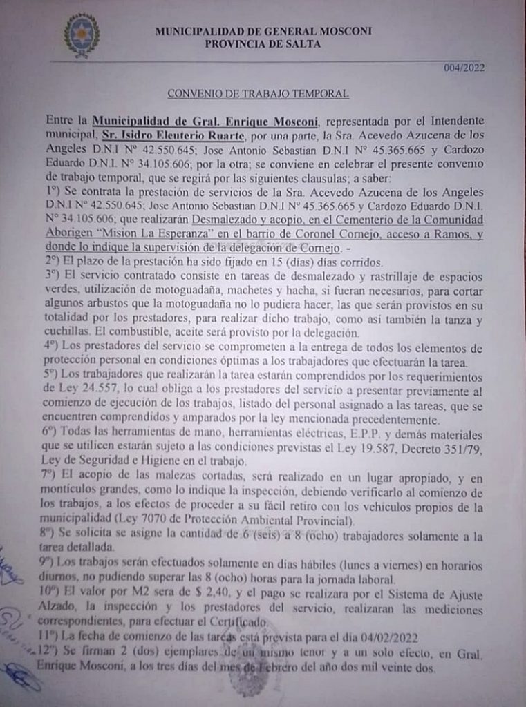 El convenio, compuesto por 12 puntos, especifica que la Municipalidad de Mosconi empleará a obreros originarios por un lapso de 15 días corridos. Azucena Acevedo, José Antonio Sebastián y Eduardo Cardozo firmaron en representación de las comunidades para comenzar los trabajos de desmalezado y acopio en el Cementerio de misión “La Esperanza”, en barrios de Cornejo, en el camino de acceso a Yacimiento Ramos y en todo espacio donde indique la Delegación Municipal.