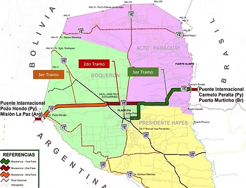 Hace un mes, Alfredo Sánchez; jefe interino de la Unidad Ejecutora de Proyectos de Fonplata; informaba que se ha había solicitado la orden para el inicio de los contratos de los lotes 1, 2 y 4 que corresponden al Tramo 3 del Corredor Vial Bioceánico, desde la localidad de Mariscal Estigarribia (Paraguay) y accesos hasta Pozo Hondo (Salta – Argentina), recorrido de la PY15. La obra, ya concluida con mejoramiento y pavimentación, conectará los océanos Atlántico y el Pacífico: los puertos de Santos (Brasil – Océano Atlántico) con los puertos de Iquique, Mejillones y Antofagasta (Chile – Océano Pacífico).