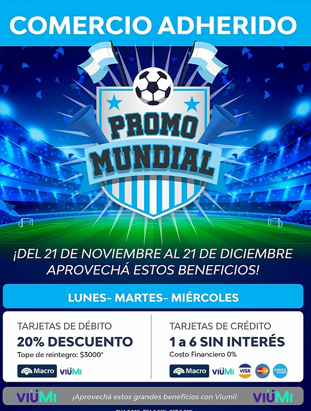 El miércoles de esta semana, el Ministerio de Economía de Salta, el Banco Macro y la Cámara de Comercio e Industria de Salta presentaron la Promo Mundial, iniciativa que otorgará descuentos y cuotas con tarjetas de crédito y débito. desde el 21 de noviembre hasta el 21 de diciembre. Estará vigente en Capital y el interior provincial, todos los lunes, martes y miércoles en los comercios adheridos. En Tartagal, el número asciende a 15.
