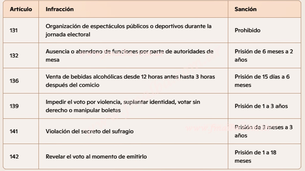 El Código Nacional Electoral establece un conjunto de normas destinadas a garantizar la transparencia, legalidad y pleno ejercicio del derecho al voto. Las conductas sancionables se dividen en: