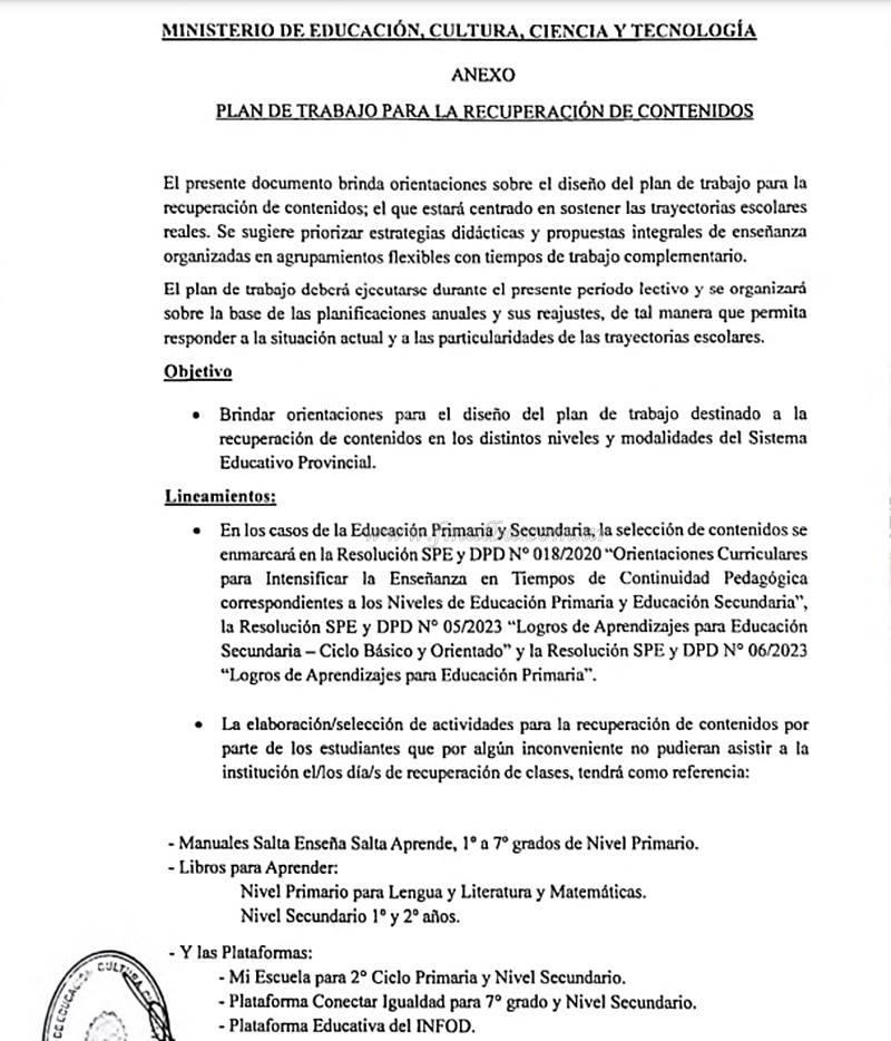 La nueva resolución 163, del Ministerio de Educación y publicada este lunes en el Boletín Oficial de Salta, accede a la petición elevada por los docentes Autoconvocados bajo el objetivo de garantizar que se recuperen los contenidos escolares luego de 39 días sin clases al 12 de junio; y también para evitar así que la cartera ejecutiva aplique descuentos salariales a los maestros que se plegaron a la huelga. Entre algunos detalles, el docente deberá consignar la cantidad de horas a devolver y la modalidad elegida, estrategia elegida, impacto en el aprendizaje y una evaluación final. El Plan incluye no solo a los docentes, sino también directivos de establecimientos, supervisores y Gestión Educativa.