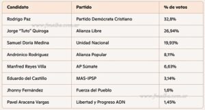 Rodrigo Paz, hijo del expresidente Jaime Paz Zamora, sorprendió al liderar la primera vuelta con una campaña austera pero efectiva. En su discurso en El Prado de La Paz, afirmó: “Lo que queremos es reconstruir la reconciliación de la patria, la producción de la patria. Queremos retomar la fuerza productiva, estabilizar y generar gobernabilidad. Que la economía sea de la gente y no del Estado”. Por su parte, Quiroga celebró el resultado como el fin de “una larga noche de dos décadas” y prometió una transición pacífica y democrática: “Bolivia va a ser ejemplo para el mundo, por la forma en que vamos a cambiar pacífica y democráticamente después de 20 años de abusos”.