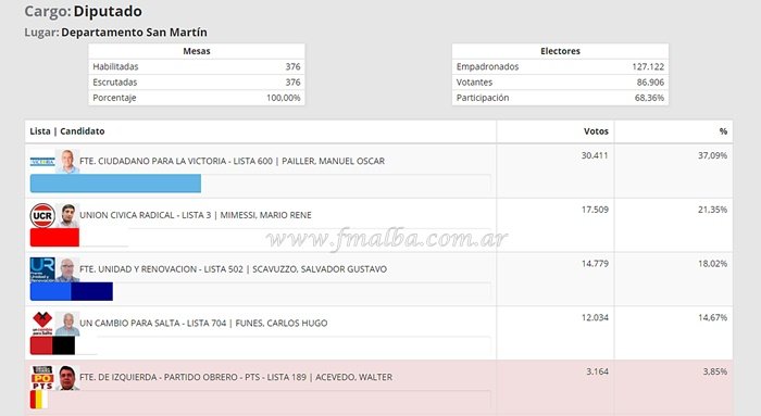 Para el cargo de Diputado Nacional por Salta se deberá aguardar por las cifras oficiales. Por Salta se registró un padrón de 705.383 votantes. Se contaron 677.536 votos afirmativos, en tanto que 12.944 fueron en blanco, se anularon 13.336 y se impugnaron 1.567, según datos de la Dirección Nacional Electoral al 23 de octubre.