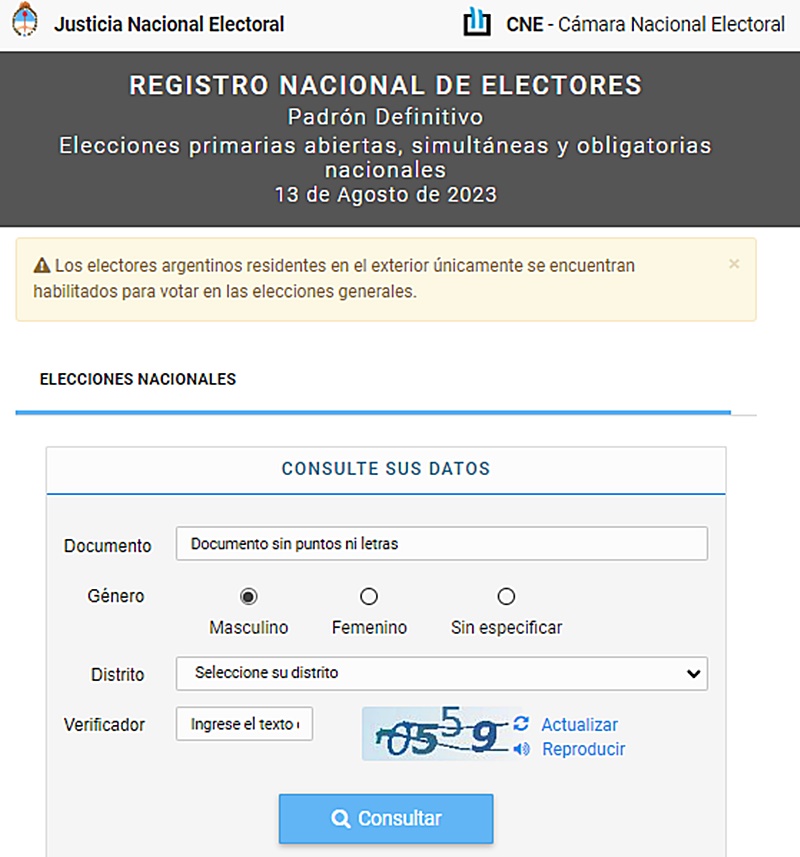 La Cámara Nacional Electoral detalló que los ciudadanos ya pueden ingresar al sitio web oficial del organismo, donde ya está habilitado el buscador oficial y en el cual deben ingresar el número de Documento Nacional de Identidad, distrito, género y un código verificador que indica la propia web. Cumplidos dichos pasos, arroja los datos de lugar y mesa de votación previstos para las primarias del domingo 13 de agosto.