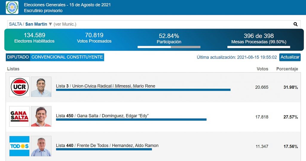 La UCR se posicionó como la primera fuerza de Tartagal, colocando a Mario Mimessi para Convencional Constituyente. De manera provisoria se colocan tres por la primera fuerza; dos por “Gana Salta” con Edgar Domínguez a la cabeza y uno por el “Frente de Todos”, con Aldo Ramón Hernández como titular.