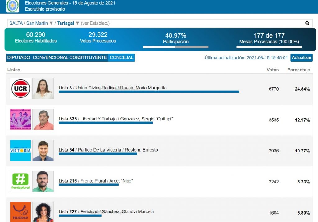 »Resultados para concejales por Tartagal (Imagen: captura de pantalla)
