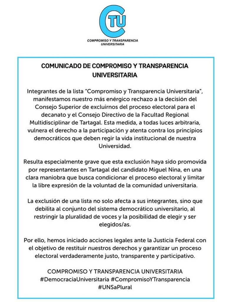 La lista “Compromiso y Transparencia” fue bajada de las elecciones, motivo por el cual lanzaron un duro comunicado achacando la decisión del Consejo Superior a presión de uno de los candidatos; de manera que serán dos las listas entre las cuales los cinco estamentos (Profesores Regulares, Estudiantes, Graduados, Auxiliares Docentes Regulares y Nodocente) deberán definir a las nuevas autoridades. Ellas son “Somos la Universidad que soñamos”, que lleva para renovar sus mandatos a Daniel Hoyos y Nicolás Innamorato; y “Unidad y Autonomía Universitaria + Comunidad”, de Miguel Nina y María Rita Martearena.