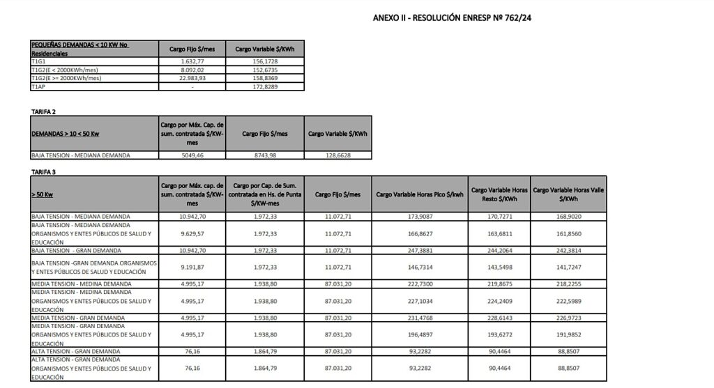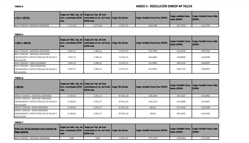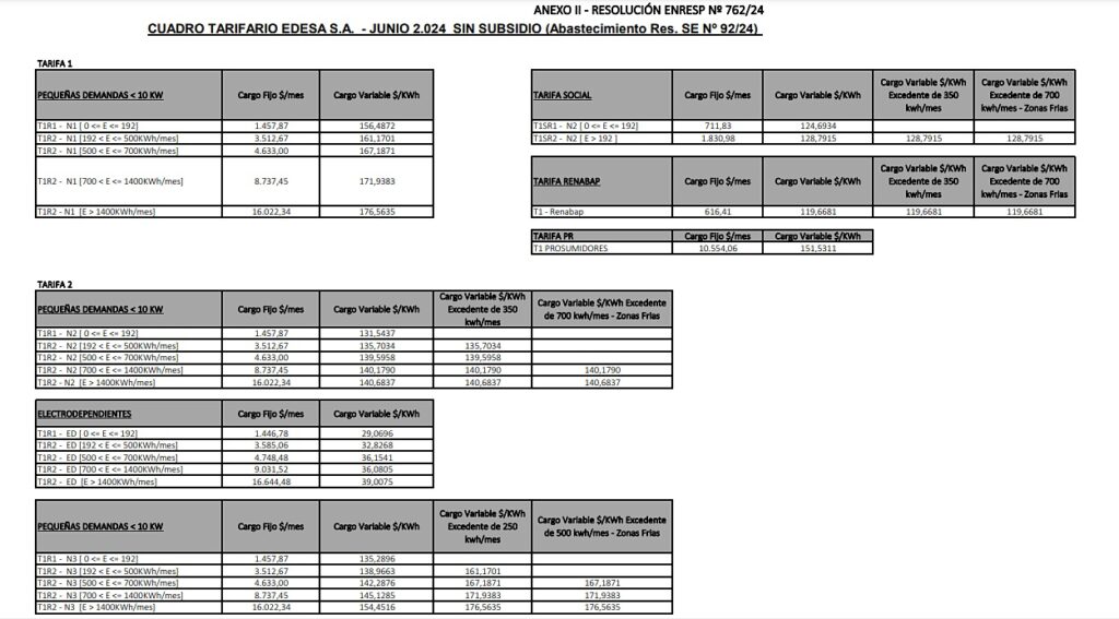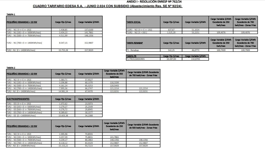 Se rechaza, no obstante, el recurso de aclaratoria de Edesa SA del 4 de junio (Nota DS 512/24), por no constituir materia impugnable bajo el artículo 176 de la Ley de Procedimientos Administrativos de la Provincia de Salta (Ley 5348/78) y por vigencia de la Resolución ENRESP 295/24, que suspende la actualización tarifaria del Valor Agregado de Distribución dispuesta por la Resolución ENRESP 150/24; pero se aprueban los Cuadros Tarifarios con subsidio y sin subsidio para el periodo comprendido entre el 1 y el 30 de junio de este año, “registrándose los efectos jurídicos y económicos imperativos dispuestos para el Mercado Eléctrico Mayorista (MEM) por la Resoluciones Nº 90/24 y 92/24 de la Secretaría de Energía de la Nación – publicadas el 5 de junio de 2.024 en Boletín Oficial – conforme el programa de segmentación dispuesto por el Decreto Nacional Nº 332/22, el Decreto Nacional N° 465/24 y las Resoluciones de la Secretaría de Energía de la Nación”.