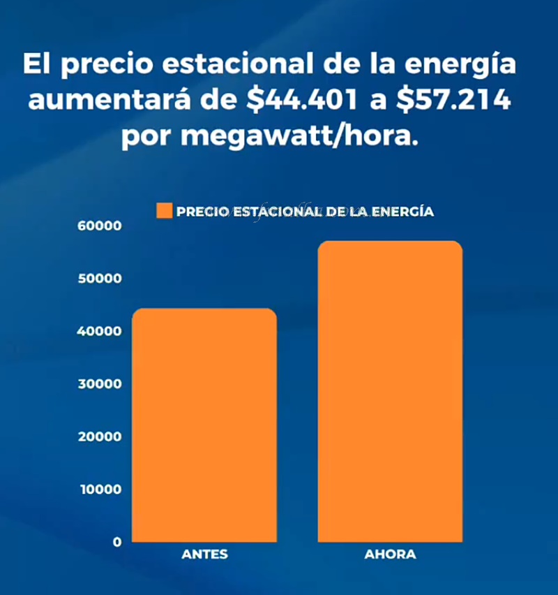 El precio estacional de la energía aumentará de 44.401 pesos y 57.214 por megawatt/hora, número al cual se aplica un subsidio que dependerá de su categoría de usuario; ya que los porcentajes se redujeron de acuerdo a las normativas emitidas por el gobierno nacional: