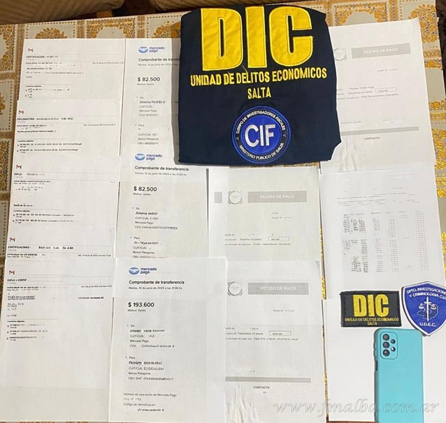 Las tres personas investigadas actuaban una en el norte, otra en el sur provincial y un hombre en San Carlos de Bariloche. Una de ellas es una docente y preceptora de un colegio secundario de Joaquín V. González (Anta), con domicilio en Coronel Mollinedo (Anta), quien captaba y era nexo territorial en el distrito sur, operando bajo el contacto “Prof. Vende Diplomaturas”, ofrecía títulos sin cursado y con calificaciones asignadas, reiendo pagos en cuentas a su nombre.