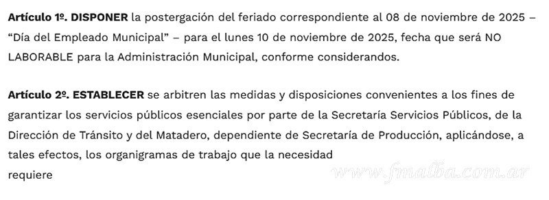 La medida alcanza a toda la administración municipal, aunque se aclara que se garantizarán los servicios públicos esenciales. Según lo establecido en el artículo 2° de la resolución, la Secretaría de Servicios Públicos, la Dirección de Tránsito y el Matadero municipal deberán aplicar los organigramas necesarios para asegurar su funcionamiento durante el feriado.